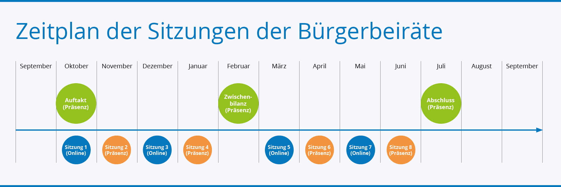 Der Bürgerbeirat Gesundheit wird von Oktober 2021 bis Juni 2022 circa einmal monatlich zusammentreten.