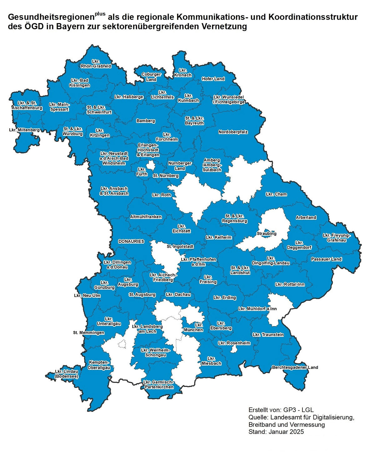 Seit 2015 gibt es in Bayern die Gesundheitsregionen Plus. Das Konzept wurde vom Bayerischen Staatsministerium für Gesundheit und Pflege entworfen und wird jährlich mit bis zu 50.000 € bezuschusst. Die Beantragung einer Gesundheitsregion Plus erfolgte für die Kommunen auf freiwilliger Basis. Seit dem 01. Januar 2025 sind die ersten Gesundheitsregionen Plus verstetigt worden. Ab den 01.01.2027 sollen alle weiteren Gesundheitsregionen Plus verstetigt sein.